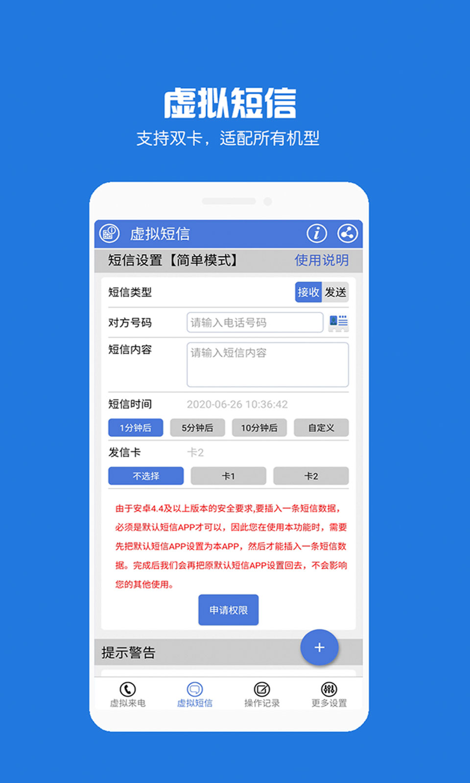 虚拟电話短信app是一款好用的小工具,手机软件可以一键设定按时来电或短信,可以协助客户用于应付查验,脱身,搞怪好朋友这些,功能齐全,应用简洁便捷,感觉很好的朋友们热烈欢迎前去下载并安装。